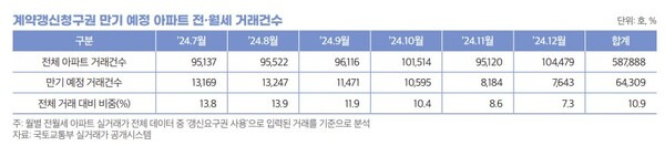 대한건설정책연구원이 국토교통부의 실거래가 데이터를 분석한 자료에 따르면 올해 계약갱신권이 만료되는 전국 아파트 전월세 물량은 총 6만4309가구로 이는 전체 아파트 거래량 대비 10.9% 수준에 해당하는 양이다.