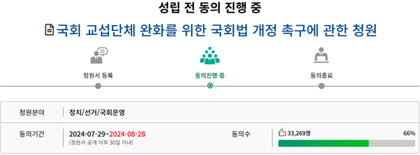 한편, 해당 청원에는 7일 현재 3만3269명이 동의한 상태다. 소수정당을 중심으로 다시 시작된 교섭단체 구성요건 완화 논의가 어떻게 진행될지 관심이 집중된다.