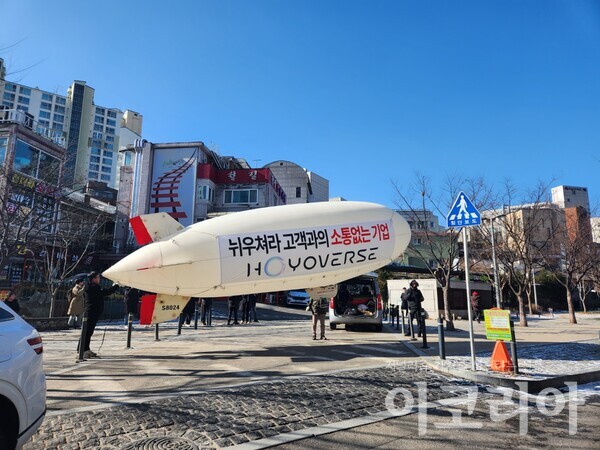 <이코리아>는 비행선의 첫 비행이 시작된 21일 시위 현장을 찾았다. 오전부터 경의선 책거리의 한 공터에서 비행선이 이륙 준비를 시작했다. 비행선에는 유저들의 의견을 모아 선정된 문구 '혐오표현 방치말고 개선의지 촉구하라'와 '뉘우쳐라 고객과의 소통 없는 기업'이 양쪽에 부착되었다.