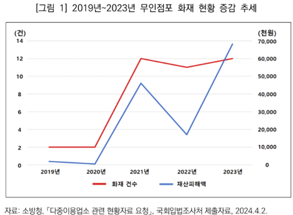 소방청 자료에 따르면 최근 5년간 무인점포에서 발생한 화재 건수는 39건이며, 재산피해액은 133,690천원에 달한다. 무인점포 수가 늘어나기 시작한 2021년부터는 화재 건수의 증가와 재산피해액이 가파르게 증가하는 추세다.