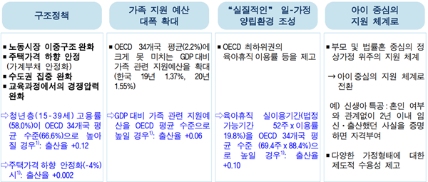 저출산‧고령화 추세가 계속될 경우 경제성장률이 마이너스로 전환할 수 있다는 전망이 나왔다. 낮은 육아휴직 사용률만 OECD 평균 수준으로 높여도 출산율이 0.1명 높아지는 효과가 있는 만큼, 정부가 관련 제도가 실질적으로 작동하도록 적극적으로 나서야 한다는 주장도 제기된다.