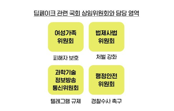 현재 국회에서는 딥페이크 범죄에 대한 법안이 28건이나 발의된 상황이다. 조은희 국민의힘 의원은 현행법상 아동과 청소년 대상 디지털 성범죄에 대해서만 허용되는 위장 수사의 허용 범위를 성인까지 확대하는 개정안을 대표 발의했다. 더불어민주당의 김한규·한정애 의원은 영상물 유포자는 물론 시청자까지 처벌하는 개정안을, 김장겸 국민의힘 의원은 일정 규모 이상의 온라인 플랫폼 사업자에 AI 생성물 표기를 의무화하는 법안을 대표 발의했다.
