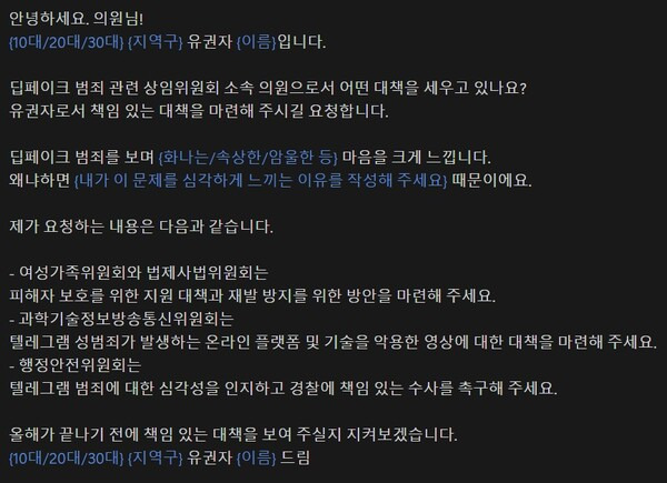 뉴웨이즈는 각 상임위원장과 여야 간사들의 메일과 전화번호, 선거구 등을 알리며 국회에 딥페이크 문제 해결을 요청하라고 독려한다. 해당 의원의 지역구 유권자라면 메일을 읽고 답할 확률이 더 높다고 알리며 요청 메일 예시문도 같이 기재했다.