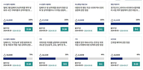 국회 전자 청원엔 지난달 30일 ‘텔레그램 딥페이크 성 착취물 제작 및 유포 사건 가해자들의 강력 처벌 및 신상 공개 요청에 관한 청원’이 올라왔다. 5일 현재 8만 2490명의 동의를 받은 해당 청원은 지난 2일 소관위원회인 국회 법제사법위원회에 회부되었다.