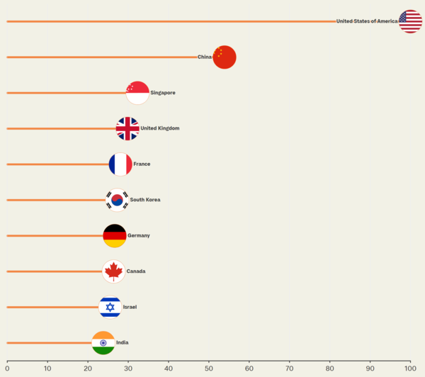 한국은 지난해와 동일하게 6위를 기록했다. 특히 개발(3위), 정부 전략(4위), 인프라(6위) 등에서 높은 평가를 받으며, AI 기술 발전과 정부의 전략적 지원이 강점으로 작용했다. 미국과 중국은 각각 압도적인 1위와 2위를 차지했으며 그 뒤를 싱가포르, 영국, 프랑스가 이었다.