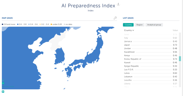 한국의 AI 준비도가 부족하다는 평가는 지난번 IMF의 조사에서도 드러났다. 지난 6월 IMF에서 발표한 176개국의 AI 준비 지수(AI Preparedness Index)에서 한국은 세계 15위를 기록했다. AI 준비지수는 디지털 인프라, 인적 자본, 기술 혁신, 법적 프레임워크 4가지 요소를 종합적으로 평가해 각국 정부의 AI 준비 수준을 평가하는 지수다. 개별 국가의 기술 발전 수준보다는 사회적, 제도적 AI 채택 준비 수준에 초점을 맞추고 있다. 1위는 AI 대비 지수 0.8의 싱가포르가 차지했으며 덴마크(0.78)와 미국(0.77)이 각각 2위와 3위를 기록했다. 한국의 경우 0.73을 기록했다.