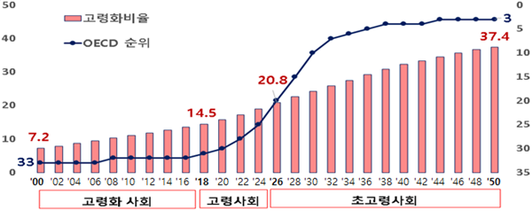 실제 한국이 고령화사회에서 고령·초고령사회(2025년으로 가정)로 진입하는데 소요된 기간은 각각 18년, 7년인데 이는 OECD 34개국 중 가장 짧다. 튀르키예(20년, 13년), 일본(25년, 10년), 멕시코(23년, 14년) 등 고령화 속도가 빠른 국가들과 비교해도 차이가 크다. 특히 초고령사회로 진입하는데 걸리는 기간이 10년 미만인 국가는 한국이 유일하다.