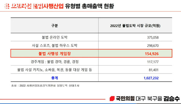 김승수 국민의힘 의원은 게임위가 사행성 게임장 등 불법행위를 단속하는 과정에서 직원 30명이 1,500건을 점검하고 있으며, 단속 후 조치도 제대로 이뤄지고 있지 않다고 주장했다. 또 대리 게임과 핵 프로그램 등을 제도적으로 막을 장치도 없다고 지적했다.