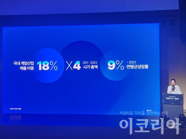 우선 기업적 가치의 경우 김 대표는 30년 전 역삼동의 작은 오피스텔에서 시작한 넥슨이 이제 연매출 4조원 돌파를 목전에 둔 대기업이 되었다는 점을 강조했다. 또 지난해 넥슨의 연결 매출은 국내 게임 산업 총 매출의 약 18%를 차지했으며, 시가총액은 2011년 상장 이후 4배 상승했고 2023년까지 매출 연평균 성장률은 9%에 달한다고도 설명했다.