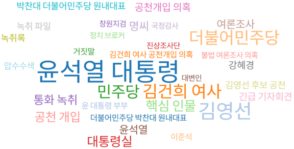 명태균 녹취록 관련 보도에 가장 자주 등장한 연관 키워드는 ‘윤석열’ 대통령의 이름이었으며, 그 뒤는 ‘김영선’ 전 의원, ‘김건희’ 여사, ‘더불어민주당’ 등의 순이었다.