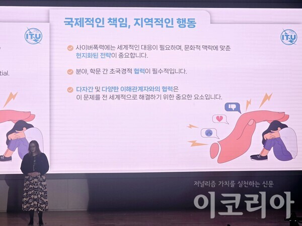 UN 국제전기통신연합(ITU)의 우르술라 윈호벤(Ursula Wynhoven) 대표는 “전세계 청소년 3명 중 1명이 사이버폭력을 경험한다”며 “사이버폭력에 대응하기 위해서는 초국경적 협력이 필요하다. 피해자 지원, 포괄적 교육 캠페인 등 국제적 협력을 통해 힘을 모아야 한다”고 말했다.