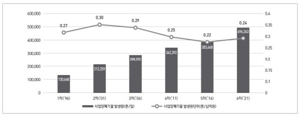 실제 국내 폐기물 배출량은 지속적으로 증가하고 있다. 환경부의 2022년 제6차 전국폐기물통계조사에 따르면 GDP 대비 사업장폐기물 발생원단위는 0.24톤/십억원으로, 2016년 제5차 조사의 0.25톤/십억원에 비해 9.1% 증가했다. 특히 팝업스토어와 같은 사업장에서 배출되는 사업장 일반폐기물이 2021년엔 건설폐기물을 앞지르며 가장 큰 비중을 차지하는 것으로 나타났다.