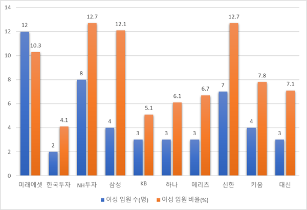 이 가운데 여성 임원 수가 두 자릿수인 곳은 미래에셋증권(12명)뿐이다. 여성 임원 비율이 두 자릿수인 곳도 NH투자증권(12.7%), 신한투자증권(12.7%), 삼성증권(12.1%), 미래에셋증권(10.3%) 등 4곳 뿐이었다. 한국투자증권의 경우 49명의 임원 중 여성 임원이 단 2명으로, 10대 증권사 중 여성 임원 비율(4.1%)이 가장 낮았다.