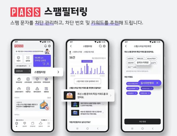 SKT 본인인증 서비스 앱인 PASS에 제공 중인 ‘PASS 스팸 필터링’ 서비스 기능도 강화했다. ‘PASS 스팸필터링’은 불법 스팸 문자를 감시하고 걸러주는 기본 기능에 ‘키워드 추천’, ‘미끼 문자 AI탐지 알림 서비스’ 등을 제공한다.
