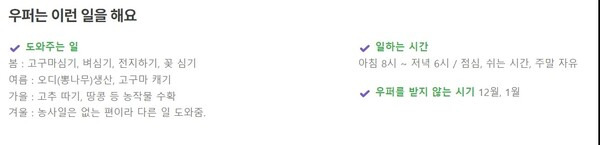 우프코리아 누리집엔 호스트의 목록이 있어 어떤 농사일을 하게 되는지 어떠한 환경에서 일하게 되는지 확인할 수 있다.