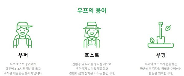 우프는 유기농 농장에 대한 세계적인 기회(WWOOF;World-Wide Opportunities on Organic Farms)의 약자로 1971년 영국에서 시작되었으며 전 세계 150여 국가에서 시행되고 있는 글로벌 네트워크 활동이다.