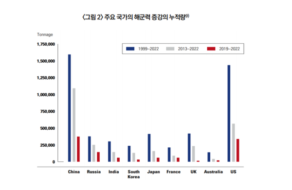 중국은 2008년 해군 함정 총톤수에서 세계 3위로 부상했는데, 한국전쟁 이후 54년 동안 비율이 88배 증가한 것이다. 특히 1999년부터 2022년까지 약 23년간 중국은 총 1백12만5000톤의 해군 함정을 증강했으며, 특히 2013년 이후의 9년간 전체 증강량의 70% 이상이 집중되었다. 이는 미국의 동기간 증강량보다 두 배 많은 수준이다.