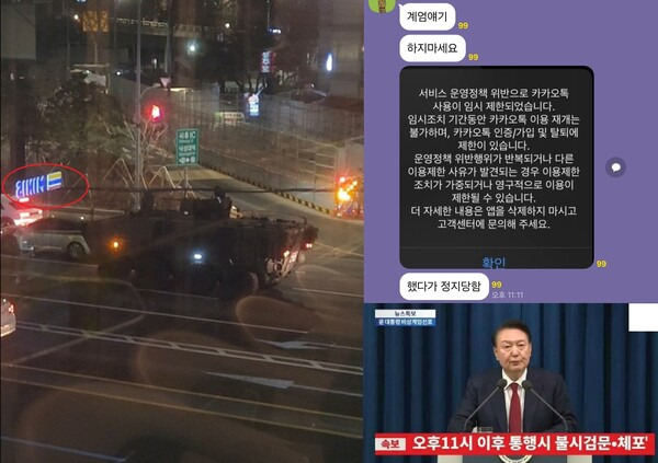 또 카카오 오픈채팅방에서는 계엄을 주제로 대화했더니 카카오톡 계정이 정지되었다는 주장이 퍼지기도 했다. 일부 오픈채팅방에서 "계엄에 대해 욕하지도 않았는데 카카오 계정을 정지당했다. 조심해라."라며 카카오톡 사용이 임시 제한된 사진이 올라왔으며, 해당 캡쳐는 다른 채팅방으로도 퍼져나갔다.