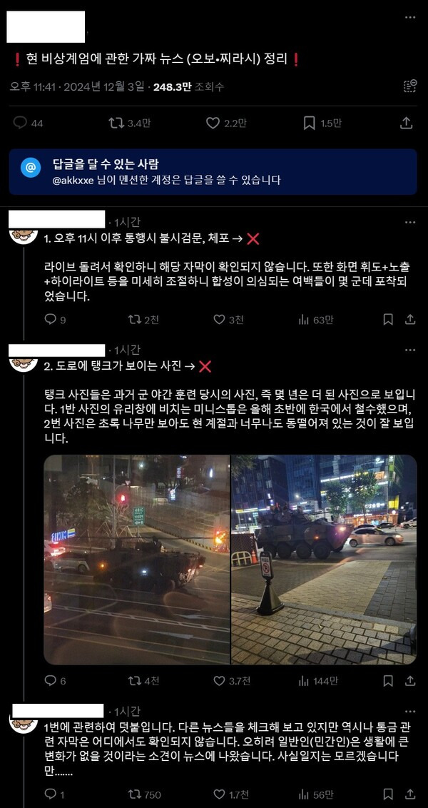 한편 가짜뉴스 확산이 혼란을 야기하는 가운데, 누리꾼들은 팩트체크를 통해 잘못된 정보를 바로잡으려는 움직임을 보이기도 했다. X(구 트위터) 등 SNS와 각종 오픈채팅방에서는 가짜뉴스 여부를 검증하거나, 허위 정보를 공유하지 말자는 취지의 게시물이 늘어나며 자정 노력이 확산되었다.