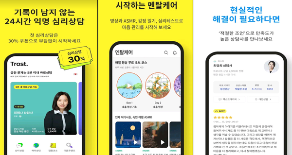 독일어로 ‘위로’, ‘위안’을 뜻하는 트로스트는 AI 챗봇과의 채팅, 전문 심리상담사와의 텍스트 테라피로 멘탈 케어를 도와주는 서비스다. 취향에 따라 ASMR 음향을 맞춤 조절하며 나만의 명상 시간을 가질 수도 있다. 상담, 심리, 임상 전공에 공인된 상담학회 자격증까지 보유한 전문가분들이 24시간 대기하고 있으니 언제든지 접속해 상담받을 수 있다는 장점이 있다.