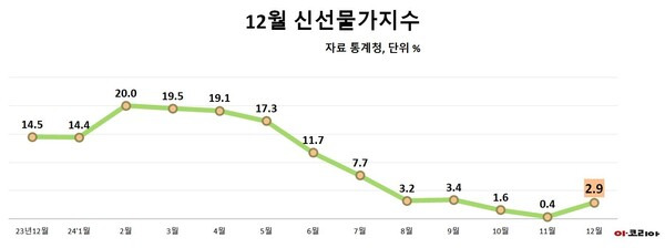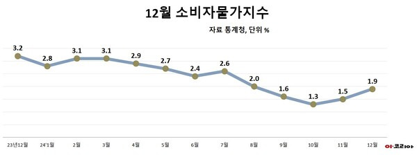 [이코리아] 올해 12월 소비자물가지수는 전월대비 0.4%, 전년동월대비 1.9% 각각 상승했다.