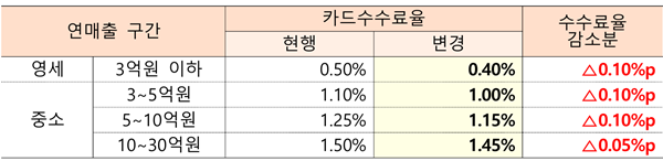 게다가 내년에는 카드수수료율 인하도 예정돼있다. 금융위원회는 지난 17일 ‘카드수수료 개편방안’을 발표하고, 내년부터 연 매출 30억원 이하인 영세·중소가맹점 카드 우대수수료율을 0.05~0.1%포인트 인하하겠다고 밝혔다. 금융위는 이번 결정으로 약 305만개의 영세·중소가맹점이 평균 8.7%, 약 179만개의 영세·중소 PG하위 사업자가 평균 9.3%의 수수료부담을 경감 받게 될 것으로 기대하고 있다.