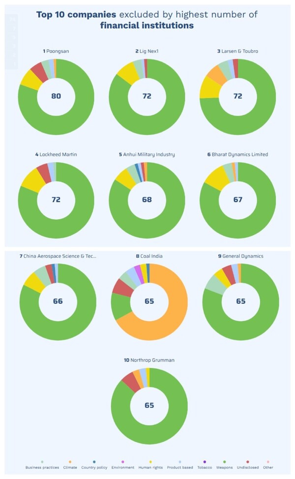 한국의 223개의 투자 배제 기업 가운데 최소 30개가 넘는 다수의 투자기관에서 배제된 회사의 경우도 지난해 8개에서 올해 11개로 증가했다. 특히 풍산(93개 기관)과 LIG넥스원(85개 기관)이 가장 많은 투자기관으로부터 배제되며, 전 세계적으로도 높은 순위를 기록했다. 풍산은 집속탄 등 비인도적 무기 생산이 주요 배제 사유로 지목됐다. LIG넥스원은 미국의 록히드 마틴과 공동 2위를 기록했다.