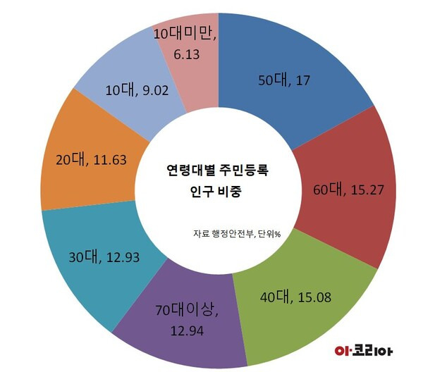 연령대별 주민등록 인구 비중은 50대가 870만6370명(17.00%)으로 가장 많고, 다음은 60대(15.27%), 40대(15.08%), 70대 이상(12.94%), 30대(12.93%), 20대(11.63%), 10대(9.02%), 10대 미만(6.13%) 순이었다.