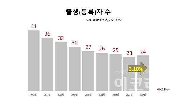 [이코리아] 행정안전부는 2024년 주민등록 인구통계 분석결과, 우리나라 출생(등록)자 수가 24만2334명으로 2023년(23만5039명) 보다 7295명(3.10%) 늘어 9년 만에 증가했다고 3일 밝혔다.