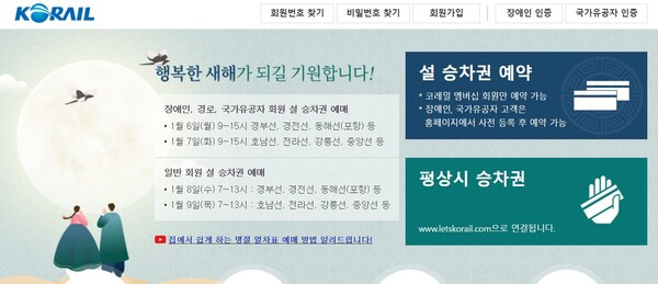 한국철도공사는 1월 6~9일 나흘간 PC·모바일 등 온라인 예매 및 전화예매를 실시한다. 예매 대상 열차는 1월 24일부터 2월 2일까지 열흘간 운행하는 열차다.
