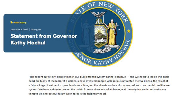 지난 3일에는 캐시 호컬 뉴욕 주지사가 뉴욕 지하철에서 이어지는 폭력 범죄에 대한 성명을 발표하며 정신건강 문제가 있는 노숙자를 비자발적으로 입원시킬 수 있도록 하겠다고 밝히기도 했다.