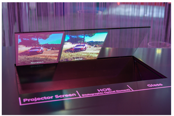 이 기술은 HOE(Holographic Optical Element)라는 광학 소자를 활용한 특수 필름을 적용해 차량 앞유리창에 필요한 정보를 구현한다. 물리적인 디스플레이 장치 없이도 주행 정보, 내비게이션, 음악 재생 목록 등 다양한 콘텐츠를 선명하게 표시하며, 밝은 환경에서도 뛰어난 화면 품질을 제공한다. 특히 운전석과 조수석 간 화면 비노출 프라이버시 기능도 지원한다.