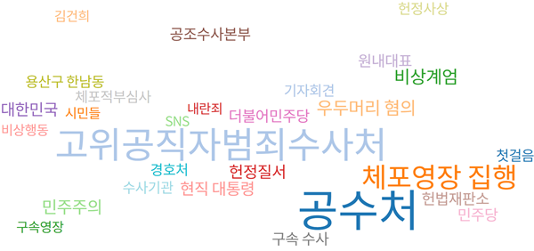 윤 대통령 관련 기사에 가장 많이 등장한 키워드는 ‘공수처’였으며, 그 뒤는 ‘체포영장 집행’, ‘우두머리 혐의’, ‘비상계엄’, 윤 대통령에 대한 조사를 맡고 있는 ‘공조수사본부’ 등의 순이었다.