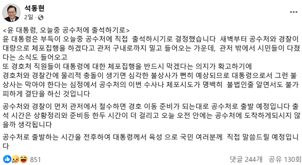 석 변호사는 이날 페이스북을 통해 “경찰이 대통령 관저에 대량 침입해서 현직 대통령을 무력으로 체포한다면 이것이 바로 내란이고 경찰의 쿠데타”라며 공수처의 체포 집행을 강하게 비판했다. 또한, 윤 대통령이 체포당한 것이 아니라 물리적 충돌에 따른 피해를 막기 위해 “어쩔 수 없이 공수처에 자진 출석”하기로 했다고 말하기도 했다.