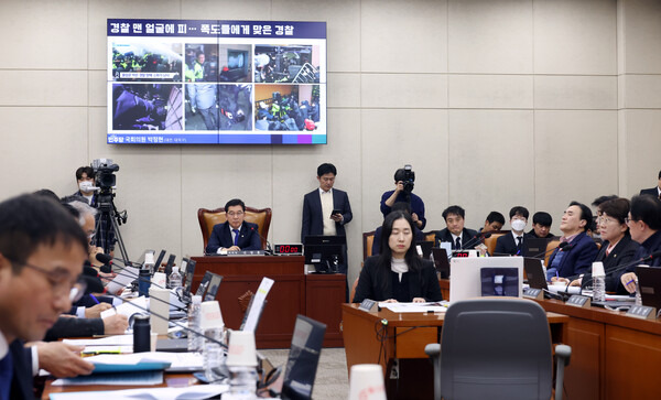 20일 서울 여의도 국회에서 열린 제421회 국회(임시회) 행정안전위원회 제1차 전체회의, 서부지법 불법 폭력점거 시위사태 관련 긴급 현안 질의에서 박정현 더불어민주당 의원의 질의 시간 동안 모니터에 관련 사진자료가 송출되고 있다. 사진=뉴시스