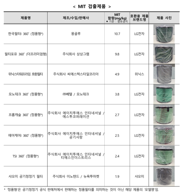 8개의 호환용 필터에서 검출된 메틸이소티아졸리논(MIT)은 노출시 호흡기, 피부, 눈 등에 자극을 일으킬 수 있어 필터형 보존처리 제품에 사용을 금지하고 있는 물질이다. 이번 조사에서 최소 1.9mg/kg에서 최대 10.7mg/kg 검출되어 부적합한 것으로 확인됐다.