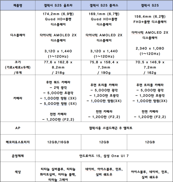 갤럭시 S25 시리즈 각 모델별 스펙 = 삼성전자 제공, 현기호 기자 정