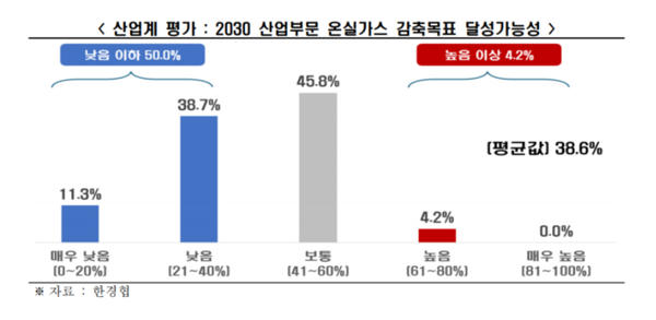 현재 우리나라는 2030년까지 온실가스 총배출량을 2018년 대비 40% 감축하는 목표를 설정한 상태다. 하지만 기업들은 이미 설정된 2030년 감축 목표조차 달성이 쉽지 않다고 토로하고 있다.
