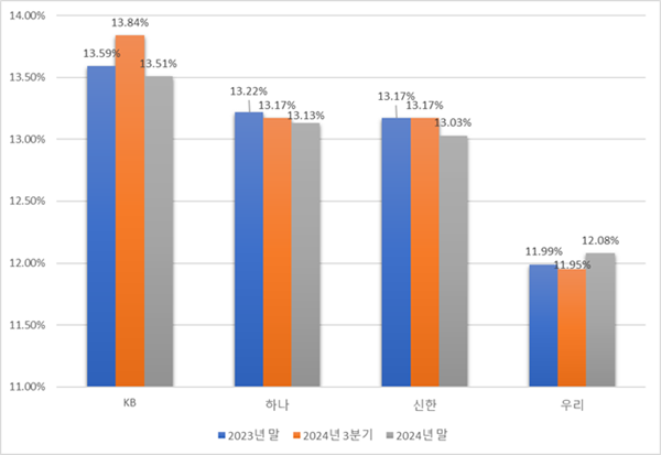 앞서 우리금융은 지난 7일 2024년 연간 경영실적을 발표하고, 지난해 말 기준 보통주자본비율(CET1)이 12.08%로 집계됐다고 밝혔다. 이는 전분기(11.95%) 대비 0.13%포인트, 전년 대비 0.18%포인트 상승한 것으로, 4대 금융 중 유일하게 개선된 것이다.