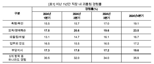 직장 내 괴롭힘 경험률 증가 추세다. 최근 1년 사이 직장 내 괴롭힘 경험이 있다는 응답은 2024년 1분기 30.5%였으나, 2분기 32%, 3분기 34%, 4분기 35.9%로 1년 새 5.4%P 증가했다.
