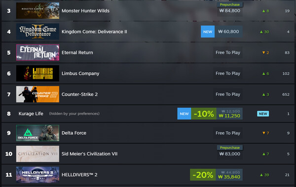 7일 2시 기준 스팀 인기게임 차트 = 스팀 차트 갈무리
