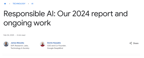 구글 측은 자사 블로그에 '책임감 있는 AI: 2024 보고서 및 진행 중인 작업 (Responsible AI: Our 2024 report and ongoing work)'이라는 게시물을 올려 원칙 수정에 대해 설명했다. 구글 수석 부사장인 제임스 매니카와 딥마인드의 데미스 하사비스가 작성한 해당 게시물에 따르면 구글이 AI 원칙을 삭제한 것이 군사적 활용을 공식적으로 허용한다는 의미는 아니며, 구글은 지난 2018년부터 매년 AI 원칙을 갱신해오고 있다고 강조했다.