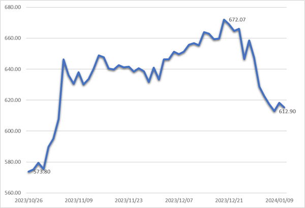 10일 한국거래소에 따르면, KRX증권지수는 전일 대비 2.88(△0.47%) 하락한 615.34에 장을 마감했다.