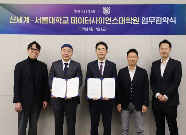 7일 서울 서초구 신세계백화점 본사에서 신세계와 서울대 데이터사이언스대학원 주요 관계자들이 참석한 가운데 인공지능·빅데이터 분야 업무협약(MOU)을 체결했다.왼쪽부터 서울대 데이터사이언스대학원 오민환 교수, 이재진 원장, 신세계백화점 영업본부장 김선진 부사장, 이성환 상무, 전진우 팀장. 사진=신세계백화점