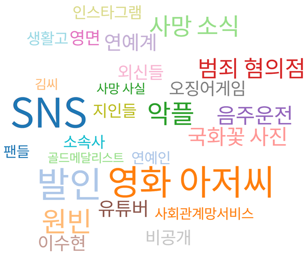 ‘악플’, ‘유튜버’ 등도 고인 관련 기사에 빈번하게 등장한 연관키워드였다. 이는 언론이 고인의 사생활을 파헤치며 인신공격도 서슴지 않았던 유튜버들과 이에 동조한 악플을 비극의 원인으로 꼽았기 때문으로 보인다.