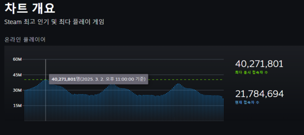 [이코리아] 글로벌 PC 게임 플랫폼 '스팀'이 최신작들의 흥행에 힘입어 전 세계 동시 접속자 수 4000만명을 돌파했다. 스팀 데이터베이스에 따르면 지난 2일 오후 11시 기준 스팀의 일일 최다 동시접속자는 4천만 명을 돌파해 40,271,801 명을 달성했으며, 이는 지난 2022년 10월 3천만 명을 돌파한 뒤 2년만이다.