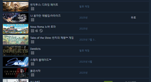이 외에도 발매일은 알려지지 않았지만 넥슨의 '빈딕투스: 디파잉 페이트', '낙원: 라스트 파라다이스', 카카오게임즈의 '아키에이지 크로니클', 네오위즈의 'P의 거짓: 서곡' 등의 국산 게임들이 스팀에서 출시를 앞두고 있다.