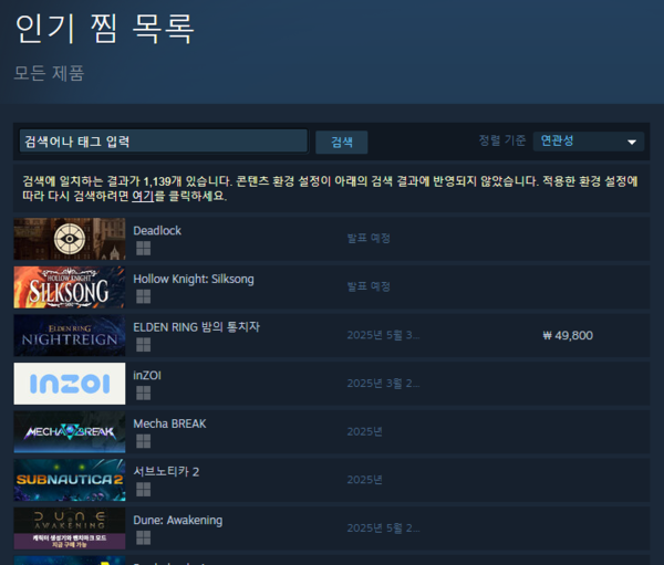 한편 국내 게임사들이 서구권 중심의 해외시장을 공략할 콘솔 지향 게임 개발을 지속하고 있는 가운데, 올해도 스팀을 통한 신작 출시가 예정되어 있어 주목받는다. 스팀의 인기 위시리스트(찜하기) 목록을 살펴보면 크래프톤이 3월 28일 발매하는 인생 시뮬레이션 게임 '인조이(inZOI)'는 데드락, 할로우 나이트 실크송 등 대작 게임들과 함께 인기 찜 목록 4위에 오른 상태이다.