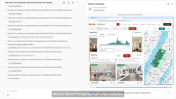 공개된 영상에서 마누스는 이력서 정리, 주가 분석, 여행 계획 수립, 부동산 검색 등 이용자가 요청하는 복잡한 작업을 스스로 수행하는 모습을 보여준다. 또 모든 작업은 클라우드에서 수행되어 이용자가 기기를 끈 상황에서도 작업을 지속할 수 있다.