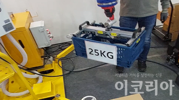 한손 작업자를 도와 25kg을 가볍게 이송시키는 로봇. 자료=여정현 필자 제공.